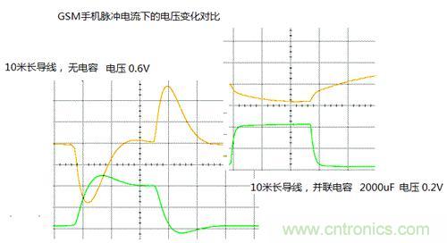 在加入電容后,對(duì)提升電路的瞬態(tài)響應(yīng)能力,往往會(huì)起到比較明顯的效果。如圖4所示的,我們?cè)谟靡粋€(gè)通用電源測(cè)量GSM手機(jī)脈沖電流,在沒(méi)有并聯(lián)電容的時(shí)候,瞬間電源跌落會(huì)達(dá)到0.6V (見(jiàn)圖4左). 對(duì)于一個(gè)工作在3.8V的手機(jī)來(lái)說(shuō),這樣大的電源跌落足以造成手機(jī)自動(dòng)關(guān)機(jī)。當(dāng)我們并聯(lián)了一個(gè)2000uF的電容后,電源跌落降到了0.2V以下,得到明顯改善,見(jiàn)圖4右所示(圖中,黃色曲線為電壓,綠色曲線為電流)。