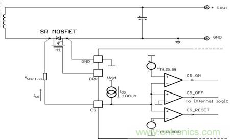 CS_OFF比較器是非常精密的真正的零比較器,通過(guò)同步整流將系統(tǒng)能效提升至最高。NCP4305的CS腳和SR MOSFET(M1) 之間的電阻用來(lái)調(diào)節(jié)關(guān)斷電流。當(dāng)CS腳電壓低于VTH_CS _ON閾值時(shí),M1 導(dǎo)通;當(dāng)CS腳電壓高于VTH_CS _OFF閾值時(shí),M1關(guān)斷。