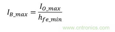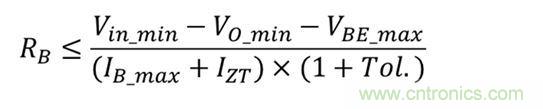 電阻器RB可為齊納二極管和晶體管基極提供電流。在運(yùn)行條件下,它應(yīng)提供足夠的電流。齊納二極管反向電流IZ應(yīng)大于1mA,正如筆者在“齊納二極管Dz的選擇”部分所討論的。方程式2可估算出運(yùn)行所需的最大基極電流: