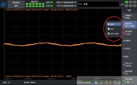 第四步,找到了想要觀察的波形幀之后,可以通過(guò)“FORM按鍵調(diào)整界面的窗口時(shí)間,對(duì)波形進(jìn)行任意放大或縮小”并可以調(diào)出光標(biāo)測(cè)量任意兩點(diǎn)的橫縱軸數(shù)據(jù)??吹竭@里我相信大部分人已經(jīng)可以找到自己想要看的波形了。但是想要把波形存儲(chǔ)記錄下來(lái)怎么辦,而且想要長(zhǎng)時(shí)間記錄可以實(shí)現(xiàn)嗎?不要急,PA功率分析儀還提供波形保存記錄功能。