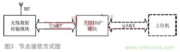 在傳感器網(wǎng)絡(luò)中,采用ZigBee通信協(xié)議時(shí),節(jié)點(diǎn)被分為Coordinator、Router以及End Device三種。Coordinator負(fù)責(zé)系統(tǒng)的初始化工作,選擇網(wǎng)絡(luò)的信道等參數(shù)建立網(wǎng)絡(luò),供其他節(jié)點(diǎn)加入;Router負(fù)責(zé)節(jié)點(diǎn)之間命令消息的路由轉(zhuǎn)發(fā)實(shí)現(xiàn);End Device負(fù)責(zé)任務(wù)是消息的發(fā)送和接收,只能和父節(jié)點(diǎn)進(jìn)行數(shù)據(jù)通信,不具有路由轉(zhuǎn)發(fā)的功能。在本系統(tǒng)中,Sink節(jié)點(diǎn)主要負(fù)責(zé)監(jiān)控網(wǎng)絡(luò)的建立、上位機(jī)命令的分析處理和操作、數(shù)據(jù)的收集等任務(wù),是整個(gè)網(wǎng)絡(luò)的數(shù)據(jù)存儲(chǔ)和處理中心,在上位機(jī)和監(jiān)控網(wǎng)絡(luò)之間起到橋梁的作用,是系統(tǒng)應(yīng)用中的Coordinator。監(jiān)控網(wǎng)絡(luò)區(qū)域內(nèi)的待定位節(jié)點(diǎn)要具備消息轉(zhuǎn)發(fā)與路由其他節(jié)點(diǎn)的能力,需要可以給所有節(jié)點(diǎn)發(fā)送消息,也可以接收到所有節(jié)點(diǎn)的消息,是系統(tǒng)應(yīng)用中的Router。每個(gè)節(jié)點(diǎn)由無(wú)線數(shù)據(jù)傳輸模塊和主控DSP模塊組成,同一節(jié)點(diǎn)的兩個(gè)模塊之間通過(guò)UART總線進(jìn)行通信。節(jié)點(diǎn)之間通過(guò)無(wú)線RF射頻方式進(jìn)行通信。Sink節(jié)點(diǎn)與上位機(jī)使用UART總線進(jìn)行通信,未知節(jié)點(diǎn)的通信方式中并不包含該通信方式。節(jié)點(diǎn)的通信方式如圖3所示。