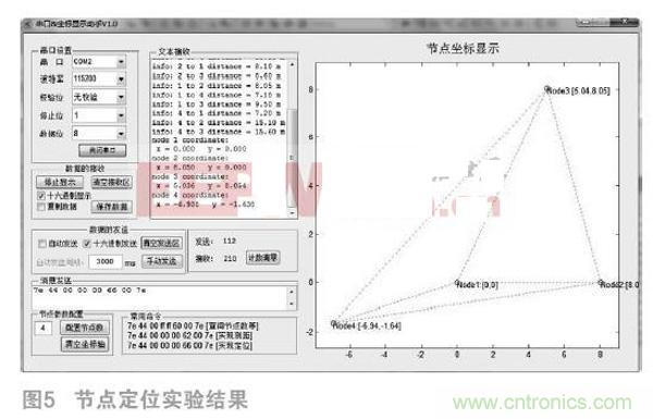 本文設(shè)計(jì)了節(jié)點(diǎn)的通信方式及消息,在統(tǒng)一的消息格式內(nèi),根據(jù)所要執(zhí)行的任務(wù)的不同,具體設(shè)計(jì)各種應(yīng)用消息;其次,根據(jù)系統(tǒng)需求和節(jié)點(diǎn)類型的不同,設(shè)計(jì)并說(shuō)明了不同節(jié)點(diǎn)的程序流程;同時(shí)設(shè)計(jì)了良好的人機(jī)交互定位界面;最后,對(duì)網(wǎng)絡(luò)節(jié)點(diǎn)的測(cè)距性能和定位性能進(jìn)行實(shí)驗(yàn)分析,驗(yàn)證了系統(tǒng)基本滿足對(duì)測(cè)距范圍和測(cè)距精度要求和節(jié)點(diǎn)定位的技術(shù)要求。