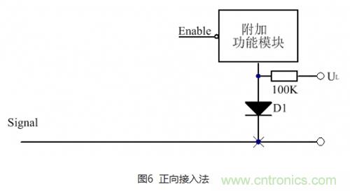 以上運用是建立在二極管單向?qū)щ娦院洼^小節(jié)電容的基礎(chǔ)上。正向接入和反向接入只能是單方向的,不能解決所有情況,也就是說只能針對特殊的功能模塊。如果附加功能模塊需要雙向的,把圖6和圖7結(jié)合或許是不錯的選擇。