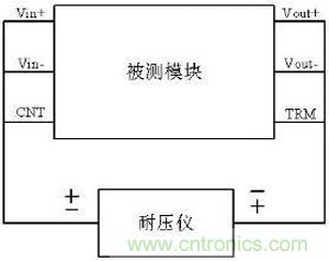 作為模塊電源的重要指標(biāo),標(biāo)準(zhǔn)中也規(guī)定了隔離耐壓相關(guān)測試方法,簡單的測試時一般采用等電位連接測試,連接示意圖如下: