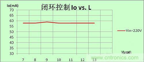 圖4可見,線性調(diào)整率為0,因為全閉環(huán)控制逐周期精確控制,輸入有任何變化,芯片會馬上檢測到并作相關(guān)的調(diào)整以便得到同樣的輸出;同理,如圖5及圖6,當(dāng)輸出電壓變化,電感量變化時,芯片也會作相關(guān)的調(diào)整;正是因為我們的全閉環(huán)高精度恒流控制方法,使電源做到了真正的恒流。這樣,量產(chǎn)的一致性可以控制到小于±1%.