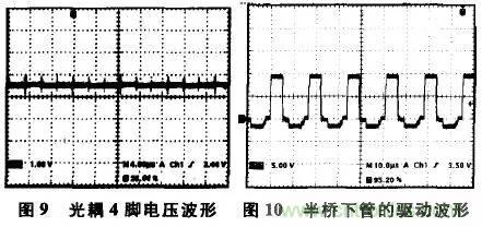 根據(jù)上述分析,以下針對(duì)不同的典型接法,對(duì)比其特性以及適用范圍。本研究以實(shí)際的隔離半橋輔助電源及反激式電源為例說明。第1種接法中,接到電壓誤差放大器輸出端的電壓是外部電壓經(jīng)電阻R4降壓之后得到,不受電壓誤差放大器電流輸出能力影響,光耦的工作點(diǎn)選取可以通過其外接電阻隨意調(diào)節(jié)。按照前面的分析,令電流If的靜態(tài)工作點(diǎn)值大約為10mA,對(duì)應(yīng)的光耦工作溫度在0~100℃變化,值在20~15mA之間。一般PWM芯片的三角波幅值大小不超過3V,由此選定電阻R4的大小為670Ω,并同時(shí)確定TL431的3腳電壓的靜態(tài)工作點(diǎn)值為12V,那么可以選定電阻R3的值為560Ω。電阻R1與R2的值容易選取,這里取為27k與4.7k。電阻R5與電容C1為PI補(bǔ)償,這里取為3k與10nF。實(shí)驗(yàn)中,半橋輔助電源輸出負(fù)載為控制板上的各類控制芯片,加上多路輸出中各路的死負(fù)載,最后的實(shí)際功率大約為30w。實(shí)際測(cè)得的光耦4腳電壓(此電壓與芯片三角波相比較,從而決定驅(qū)動(dòng)占空比)波形,如圖9所示。對(duì)應(yīng)的驅(qū)動(dòng)信號(hào)波形,如圖10所示。圖10的驅(qū)動(dòng)波形有負(fù)電壓部分,是由于上、下管的驅(qū)動(dòng)繞在一個(gè)驅(qū)動(dòng)磁環(huán)上的緣故??梢钥闯?,驅(qū)動(dòng)信號(hào)的占空比比較大,大約為0.7。