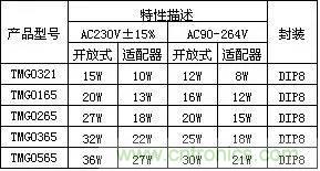 TMG0321/TMG0165/TMG0265/TMG0365芯片是一款高集成度、高性能的PWM+MOSFET管二合一的電流型離線式開關(guān)電源控制器。適用于充電器、電源適配器、LED驅(qū)動(dòng)電源等各類小功率的開關(guān)電源。采用DIP8封裝,無需加散熱器可輸出0~36W的功率(加散熱可以做到更大)。電路結(jié)構(gòu)簡(jiǎn)單,成本低。具有完善的保護(hù)功能,包括過壓、欠壓、過溫、過載及短路等保護(hù)。固定振蕩頻率及抖頻功能,可以降低EMI。待機(jī)功率低,在待機(jī)時(shí)進(jìn)入跳周期模式,符合“能源之星”等待機(jī)功耗標(biāo)準(zhǔn)要求。