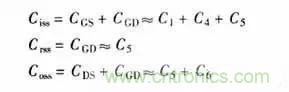 MOS管輸入電容(Ciss)、跨接電容(Crss)、輸出電容(Coss)和柵源電容、柵漏電容、漏源電容間的關(guān)系如下: