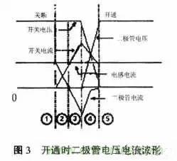 開關(guān)管的開關(guān)模式電路如圖2所示,二極管可是外接的或MOS管固有的。開關(guān)管在開通時的二極管電壓、電流波形如圖3所示。