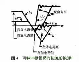 圖4是存儲電荷高或低的兩種二極管電流、電壓波形。從圖中可以看出存儲電荷少時,反向電壓的斜率大,并且會產(chǎn)生有害的振動。而前置電流低則存儲電荷少,即在空載或輕載時是最壞條件。所以進(jìn)行優(yōu)化驅(qū)動電路設(shè)計時應(yīng)著重考慮前置電流低的情況,即空載或輕載的情況,應(yīng)使這時二極管產(chǎn)生的振動在可接受范圍內(nèi)。