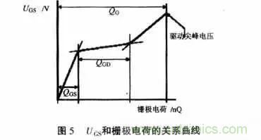 柵極電荷QG包含了兩個部分:柵極到源極電荷QGS;柵極到漏極電荷QGD—即“Miller”電荷。QGS是使柵極電壓從0升到門限值(約3V)所需電荷;QGD是漏極電壓下降時克服“Miller”效應(yīng)所需電荷,這存在于UGS曲線比較平坦的第二段(如圖5所示),此時柵極電壓不變、柵極電荷積聚而漏極電壓急聚下降,也就是在這時候需要驅(qū)動尖峰電流限制,這由芯片內(nèi)部完成或外接電阻完成。實(shí)際的QG還可以略大,以減小等效RON,但是太大也無益,所以10V到12V的驅(qū)動電壓是比較合理的。這還包含一個重要的事實(shí):需要一個高的尖峰電流以減小MOS管損耗和轉(zhuǎn)換時間。