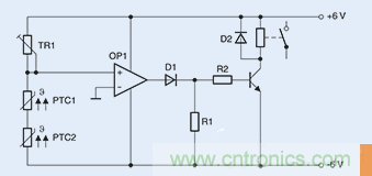 切換原理:記錄溫度限值圖3顯示為由兩個串聯(lián)正溫度系數(shù) (PTC) 傳感器組成的一個簡單電路,。TR1與兩個正溫度系數(shù) (PTC) 傳感器組成一個分壓器,該分壓器能夠提供運算放大器的非反相輸入,而運算放大器則充當(dāng)比較器的角色。