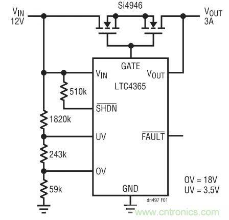 圖 1 示出了一款完整的應(yīng)用電路。一個阻性分壓器負責(zé)設(shè)定用于負載與 VIN 連接 / 斷接的過壓(OV)和欠壓 (UV) 跳變點。如果輸入電源漂移至該電壓窗口之外,則 LTC4365 將迅速把負載與電源斷接。