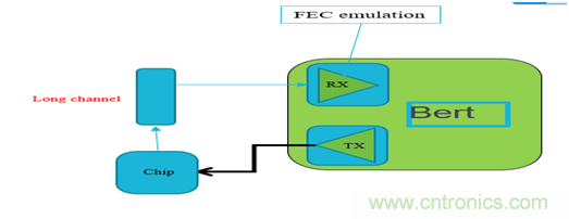客戶的芯片的接收端可以支持FEC的糾錯(cuò)功能,但要測(cè)試在不同的channel條件和不同的發(fā)送端均衡的設(shè)定下,芯片經(jīng)過FEC后的誤碼率能降低到多少,如果將信號(hào)直接環(huán)回到芯片的輸入端的話,需要不停的修改芯片的FEC的參數(shù)來進(jìn)行測(cè)試,但由于其芯片每修改一次FEC的參數(shù)如FEC的symbol size, block size,content size等等都需要重新對(duì)芯片進(jìn)行代碼編譯和下載,每次下載需要幾分鐘的時(shí)間,由于不同的條件都要測(cè)試,則組合數(shù)量很多,導(dǎo)致測(cè)試效率非常低。