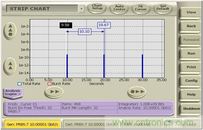 由于客戶的系統(tǒng)要進(jìn)行長(zhǎng)時(shí)間的(-20到+80度下)的高低溫老化測(cè)試,客戶要看誤碼的性能和溫度變化的相關(guān)性,一般的誤碼儀只能統(tǒng)計(jì)溫度變化過程中誤碼的總的個(gè)數(shù)和誤碼率,而無(wú)法得知在整個(gè)十幾個(gè)小時(shí)里面任一時(shí)刻誤碼率的變化。而BSX系列誤碼儀則可以使用Strip chart的記錄功能將整個(gè)過程中記錄下來,后面可以根據(jù)需要查詢?nèi)我鈺r(shí)刻的誤碼率變化情況。如下圖,在第10/20/30秒的時(shí)間點(diǎn)出現(xiàn)了一些突發(fā)的誤碼,這個(gè)如果僅僅是通過簡(jiǎn)單的誤碼統(tǒng)計(jì)是無(wú)法看到時(shí)間相關(guān)的細(xì)節(jié)的,而且其累積記錄時(shí)間可以長(zhǎng)達(dá)幾十小時(shí)甚至幾天。