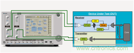 如圖3,除了loopback training以外,另一個(gè)重要的步驟是link training(鏈路協(xié)商),需要Bert和DUT進(jìn)行FFE/DFE的實(shí)時(shí)協(xié)商來補(bǔ)償鏈路的損耗,以達(dá)到最低的誤碼率。在USB3.1/PCIe協(xié)議中發(fā)送端會(huì)有多個(gè)級(jí)別的FFE來靈活對(duì)信號(hào)發(fā)送端進(jìn)行均衡補(bǔ)償,在接收端也會(huì)有CTLE和DFE多級(jí)組合來進(jìn)行補(bǔ)償。(詳細(xì)的鏈路協(xié)商步驟細(xì)節(jié)可以參考泰克的相關(guān)應(yīng)用文章-《克服第4代I/O應(yīng)用中的接收機(jī)測(cè)試挑戰(zhàn)》)。這個(gè)鏈路協(xié)商同樣需要Bert能夠在一定程度上去模擬一個(gè)真實(shí)設(shè)備和被測(cè)設(shè)備進(jìn)行溝通,解析并響應(yīng)被測(cè)設(shè)備的要求去調(diào)節(jié)信號(hào)輸出的FFE參數(shù),并根據(jù)誤碼率來請(qǐng)求被測(cè)設(shè)備調(diào)節(jié)其輸出的FFE參數(shù)和接收端的CTLE/DFE參數(shù),以達(dá)到最佳的誤碼率。同樣這個(gè)時(shí)候也需要BERT具備單通道直接輸出和接收并解析基于協(xié)議的碼型序列達(dá)到與被測(cè)設(shè)備的實(shí)時(shí)協(xié)商。