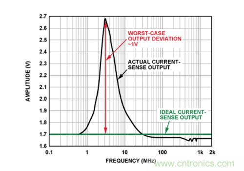 圖2所示為輸入在較寬頻率范圍內(nèi)變化時電流傳感器的直流輸出與其理想值的偏差情況。從圖中可以看出,在1 MHz至20 MHz的頻率范圍內(nèi),偏差最為顯著(>0.1 V),且3 MHz時直流誤差達到最大值(1 V),這在放大器0 V至5 V的輸出電壓范圍中占據(jù)很大比例。