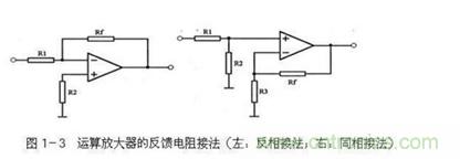 其次,由于放大倍數(shù)為無窮大,所以不能將運(yùn)算放大器直接用來做放大器用,必須要將輸出的信號反饋到反相輸入端(稱為負(fù)反饋)來降低它的放大倍數(shù)。如圖1-3中左圖所示,R1的作用就是將輸出的信號返回到運(yùn)算放大器的反相輸入端,由于反相輸入端與輸出的電壓是相反的,所以會減小電路的放大倍數(shù),是一個(gè)負(fù)反饋電路,電阻Rf也叫做負(fù)反饋電阻。