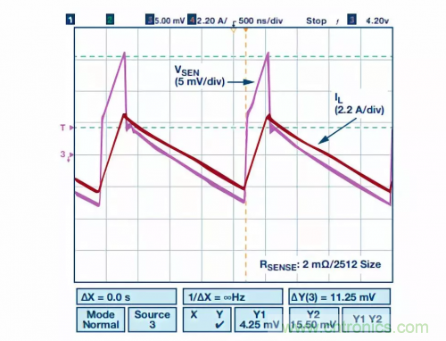 檢測(cè)電阻ESL的影響可能很輕微,也可能很嚴(yán)重。ESL會(huì)導(dǎo)致開(kāi)關(guān)柵極驅(qū)動(dòng)器發(fā)生明顯振蕩,從而對(duì)開(kāi)關(guān)導(dǎo)通產(chǎn)生不利影響。它還會(huì)增加電流檢測(cè)信號(hào)的紋波,導(dǎo)致波形中出現(xiàn)電壓階躍,而不是預(yù)期的如圖13所示的鋸齒波形。這會(huì)降低電流檢測(cè)精度。