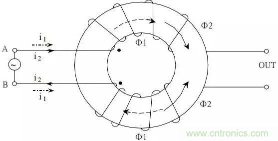 如圖所示,在同一磁環(huán)上繞上兩組方向相反的線圈,據(jù)右手螺旋管定則可知,當(dāng)在輸入端A、B兩端加上極性相反,信號(hào)幅值相同的差模電壓時(shí),有實(shí)線所示的電流i2,在磁芯中產(chǎn)生實(shí)線所示的磁通Φ2,只要保證兩繞組完全對(duì)稱,則磁芯中兩不同方向之磁通相互抵消??偞磐榱悖€圈電感幾乎為零,對(duì)常模信號(hào)無(wú)阻抗作用。若在輸入端A、B兩端加上極性相同,幅值相等的共模信號(hào)時(shí),有虛線所示的電流i1,在磁芯中產(chǎn)生虛線所示的磁通Φ1,則磁芯中磁通有相同的方向而互相加強(qiáng),使每一線圈的電感值為單獨(dú)存在時(shí)的兩倍,而XL =ωL,因此,此一繞法的線圈對(duì)共模干擾有很強(qiáng)的抑制作用。