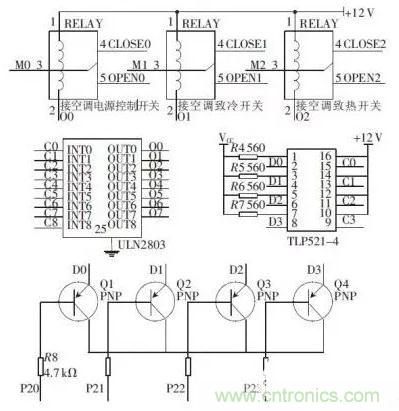 【導讀】繼電器開關模塊由TLP521 -4 、ULN2803 和SRD -12VDC 及三極管構成,由微控制器輸出的信號經(jīng)過三極管構成的開關電路送往TLP521 -4 光耦芯片再通過ULN2803 達林頓管的放大后用來驅動SRD-12DC 繼電器,進而達到控制空調的各種開關的作用。