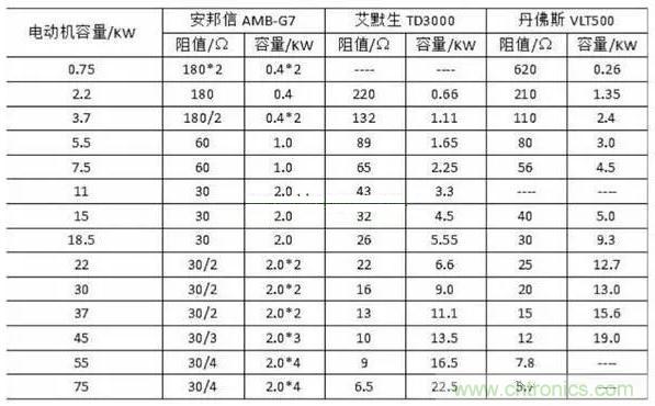 下圖所示為部分變頻器生產(chǎn)廠家提供的制動(dòng)電阻的阻值與容量。