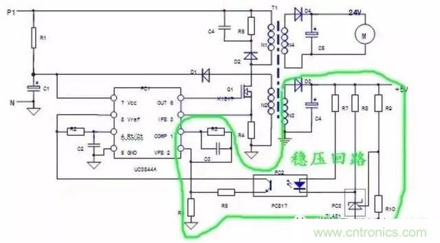當(dāng)然,PC1芯片和1,2腳外圍元件R3,C3也是穩(wěn)壓回路的一部分。