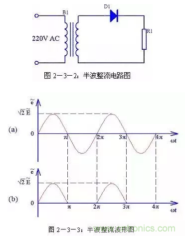 半波整流電路見圖2-3-2。其中B1是電源變壓器,D1是整流二極管,R1是負載。B1次級是一個方向和大小隨時間變化的正弦波電壓,波形如圖 2-3-3(a)所示。0~π期間是這個電壓的正半周,這時B1次級上端為正下端為負,二極管D1正向?qū)?,電源電壓加到負載R1上,負載R1中有電流通過;π~2π期間是這個電壓的負半周,這時B1次級上端為負下端為正,二極管D1反向截止,沒有電壓加到負載R1上,負載R1中沒有電流通過。在 2π~3π、3π~4π等后續(xù)周期中重復上述過程,這樣電源負半周的波形被“削”掉,得到一個單一方向的電壓,波形如圖2-3-3(b)所示。由于這樣得到的電壓波形大小還是隨時間變化,我們稱其為脈動直流。
