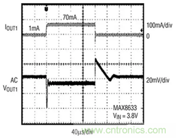 圖3:對(duì)輸出負(fù)載快速變化的瞬態(tài)電壓響應(yīng)是無線傳感器應(yīng)用的LDO關(guān)鍵性能指標(biāo)。此處所示為高性能LDO的響應(yīng)。(圖片來源:Maxim Integrated)