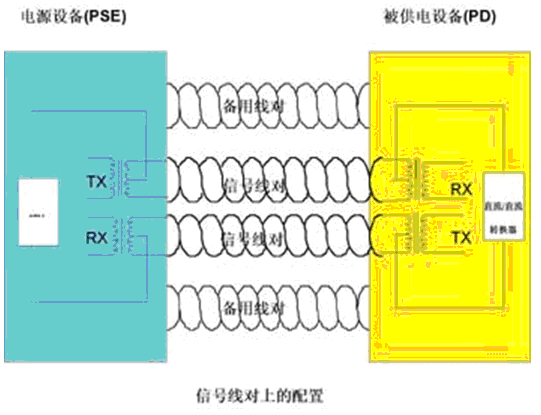 ---IEEE 802.3af標準把電源定義為13W 48V,可以通過五類信號線對配置從PSE發(fā)送這一功率,其中功率從發(fā)射機(Tx)和接收機(Rx)信號變壓器中央分接。還可以通過五類備用線對配置傳送這一電源,參見圖1。