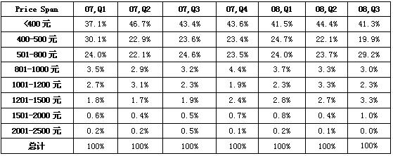 2、中低端MP3市場(chǎng)占據(jù)絕對(duì)主力,800元以下的機(jī)型超過90%