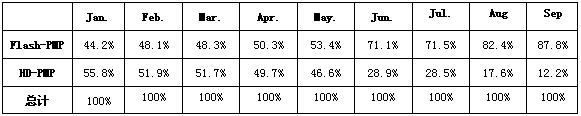 在MP3播放機(jī)領(lǐng)域,占存介質(zhì)產(chǎn)品獨(dú)占市場(chǎng),而在PMP播放機(jī)領(lǐng)域,閃存介質(zhì)已經(jīng)得到PMP播放機(jī)廠商的普遍重視。2008年1-3季度,閃存型PMP產(chǎn)品銷量份額從1月份的44.2%上升到6月的87.8%。