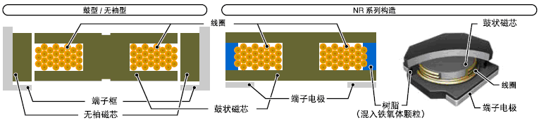 - NR 系列采用了混入鐵氧體粉末樹(shù)脂的成型技術(shù),只使用了鼓型磁芯形成了無(wú)袖構(gòu)造產(chǎn)品