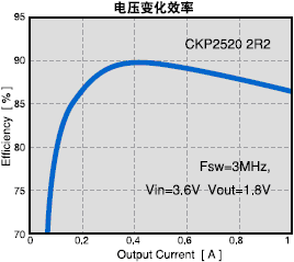 在一定條件下,決定的與降壓型DC-DC轉(zhuǎn)換器開(kāi)關(guān)頻率相對(duì)應(yīng)的電感值。開(kāi)關(guān)頻率為300kHz 的情況下,需要的是角形4mm,厚度1.8mm 或是角形6mm,厚度為1.2mm的電感。開(kāi)關(guān)頻率提升為1.5MHz 時(shí),角形3mm 厚度為1mm 電感的使用成為可能,電感的小型化也就得以實(shí)現(xiàn)。
