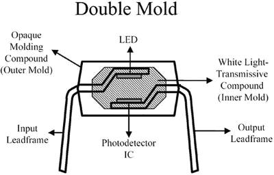 然后,組合好的引線框使用白色光傳導(dǎo)化合物進(jìn)行澆鑄,構(gòu)成光導(dǎo)裝置,把光從LED傳送到IC光電檢測(cè)器上。白色化合物還提供了高壓絕緣功能。最后,得到的組件使用不透明的化合物澆鑄,構(gòu)成最終的封裝輪廓。