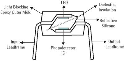 光學(xué)耦合器的工作基礎(chǔ)是LED發(fā)出的光通過(guò)透明的絕緣介質(zhì)到光電探測(cè)器,這種介質(zhì)提供2.5kV-6kV范圍的高壓絕緣。光耦合程度取決于光導(dǎo)材料。絕緣將通過(guò)光導(dǎo)材料本身或通過(guò)額外的光傳導(dǎo)介電材料實(shí)現(xiàn)。在任何情況下,LED的排列、光導(dǎo)材料、介電材料和IC都會(huì)直接影響光耦合和高壓絕緣的性能。