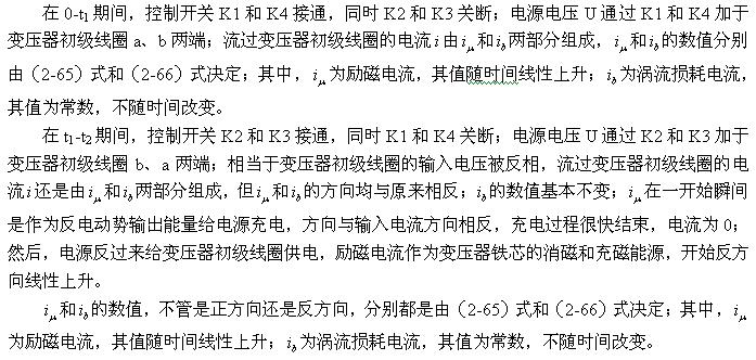 根據(jù)前面分析,磁滯損耗主要由勵磁電流 產(chǎn)生的,但雙激式開關變壓器初級線圈中的勵磁電流與單激式開關變壓器初級線圈中的勵磁電流產(chǎn)生的作用并不完全相同。單激式開關變壓器初級線圈中的勵磁電流產(chǎn)生磁場對變壓器貼芯進行充磁和退磁外,其存儲的能量只能用來作為反激式輸出給負載,因為變壓器初級線圈輸入的電壓是單極性脈沖,變壓器初級線圈無法換相。