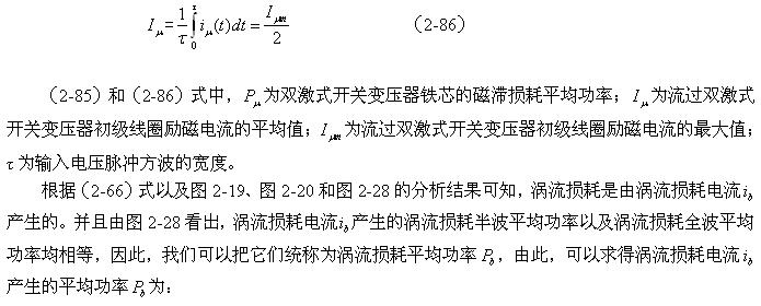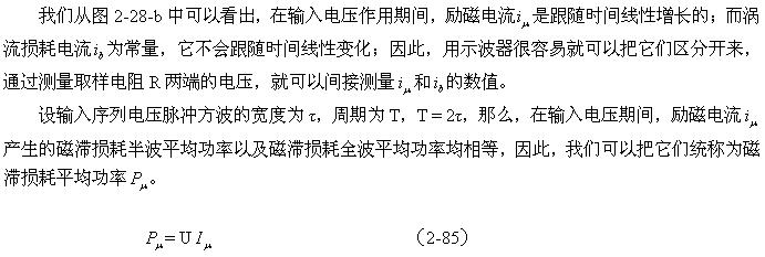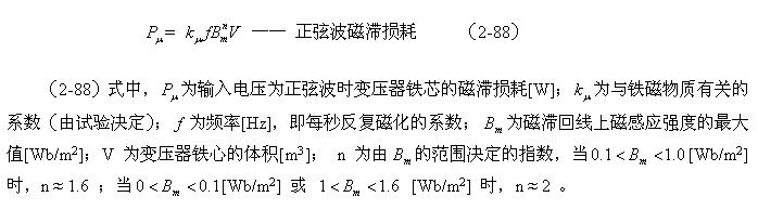 這里順便指出,利用(2-88)和(2-89)式來分別測試變壓器鐵心的磁滯損耗和渦流損耗是非常困難的;一個是它們的系數(shù)很難決定,另一個是兩者很難分別進行測量,或從測量結果中進行分離。對比兩式的參數(shù)就可以知道,它們之間最大的區(qū)別是頻率對損耗的影響程度;一個是與頻率成正比,另一個是與頻率的平方成正比。