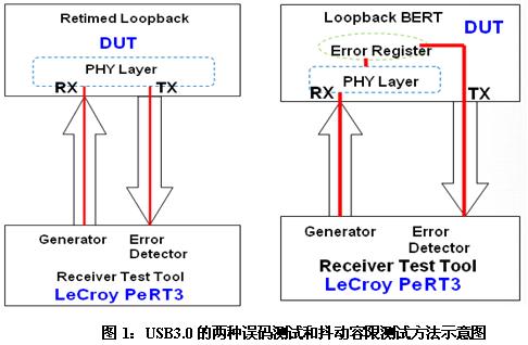 對于USB3.0的接收機(jī)測試還可以使用另一種方法:即Loopback BERT Method。如下圖1的右圖所示:DUT的接收端工作在Loopback BERT模式,直接分析BERT發(fā)送出的已知的測試碼流,對接收到的誤碼計數(shù),誤碼數(shù)量存入誤碼寄存器(如下圖1的Error Register),LeCroy PeRT3直接讀取誤碼寄存器,得到誤碼率和抖動容限測試結(jié)果。