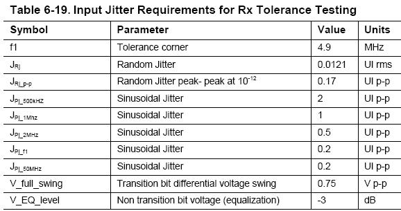 在接收機(jī)測試中,碼型發(fā)生器和待測試芯片的擴(kuò)頻時鐘功能(SSC)都打開,輸出信號的特征需滿足下圖3所示:信號的峰峰值大于750毫伏,-3dB的去加重,隨機(jī)抖動的RMS值為0.0121UI(Unit Interval的簡稱,即1個比特的時間),即0.0121*200ps = 2.42ps,添加的正弦抖動的頻率為500kHz、1MHz、2MHz、4.9MHz、50MHz,其對應(yīng)的抖動峰峰值為2UI、1UI、0.5UI、0.2UI、0.2UI。要求在添加了上述數(shù)量的隨機(jī)抖動和正弦抖動后誤碼率小于 。其中,頻率低于500KHz的抖動大于2個比特,說明USB3.0芯片的接收端需具備較強(qiáng)的抖動過濾能力,因為多數(shù)開關(guān)電源工作在這個頻段。