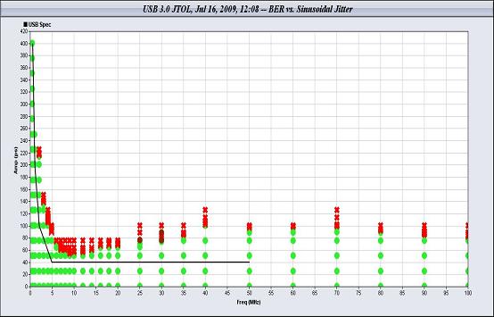 力科PeRT3可以自動測量多個頻點下的抖動容限和誤碼率,如下圖5所示為某USB3.0芯片的抖動容限測試結(jié)果,橫軸為頻率,縱軸為該頻點的抖動幅度,黑線為USB3.0規(guī)范要求的抖動容限,紅點為出現(xiàn)誤碼的正弦抖動的幅度,由于紅點都在黑線之上,說明該芯片接收端的抖動容限滿足規(guī)范要求。
