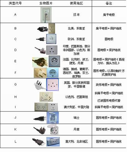 交流電墻壁插座的歷史不過80年,此間隨著用電量、用電經(jīng)驗(yàn)與事故教訓(xùn)的增加,由于技術(shù)、安全性、經(jīng)濟(jì)性等因素,加之地理、歷史、政治等原因,世界各地在發(fā)展民用電器供電裝置時(shí),并沒有采用美國最初的插座設(shè)計(jì)而形成了不同標(biāo)準(zhǔn),使得墻壁插座形式多種多樣。美國商務(wù)部統(tǒng)計(jì)了全球常見電源插頭/座(表2.1)樣式,并以字母進(jìn)行了分類。
