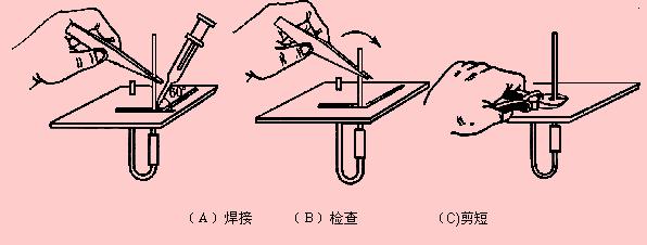 ?。?)將電阻插入印刷電路板小孔。從正面插入(不帶銅箔面)。電阻引腳留3~5毫米。