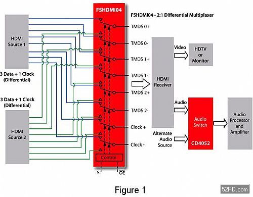 以FSHDMI04 這類HDMI開關(guān)為例,只需簡(jiǎn)單地插入到選定的HDMI接收器和兩個(gè)HDMI連接器之間即可。若針對(duì)一個(gè)完整的解決方案,還需要切換較高電壓及較低頻率的控制信號(hào),建議使用一個(gè)至少165MHz的簡(jiǎn)單5V 方型 SPDT開關(guān),例如FSAL200 或 FSAV330。這些控制信號(hào)用于接收器(Sink) 和資料源(Source) 之間的首次交換,而資料源以此來(lái)決定接收器能夠處理什麼樣的視頻解析度,只需要FSHMDI04加上第二個(gè)用于控制資料的開關(guān),即可在單輸入設(shè)計(jì)上完全實(shí)現(xiàn)第二個(gè)HDMI輸入埠。
