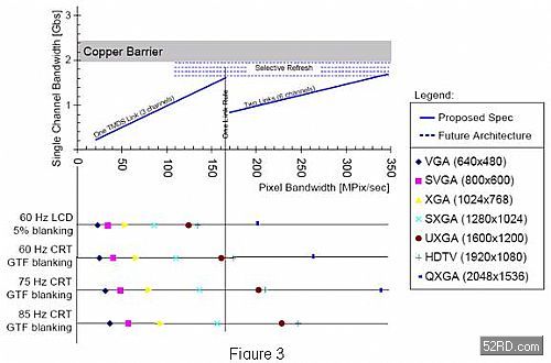 DVI是市場(chǎng)上第一個(gè)標(biāo)準(zhǔn)化的純數(shù)字視頻連接。與HDMI一樣,它對(duì)單或雙鏈路配置的需求取決于所選的顯示器解析度,以及顯示器類型和相應(yīng)的更新頻率。DVI端子在電腦應(yīng)用中仍然相當(dāng)普及,許多系統(tǒng)都具有DVI輸出以便實(shí)現(xiàn)至數(shù)字LCD 顯示器的直接數(shù)位連接。舉例說(shuō),一個(gè)更新頻率為60Hz的高解析度 LCD顯示器(1920x1080)可利用單鏈路DVI和約130MHz的時(shí)脈頻率連接。這可參考圖3 的DVI規(guī)格參考。