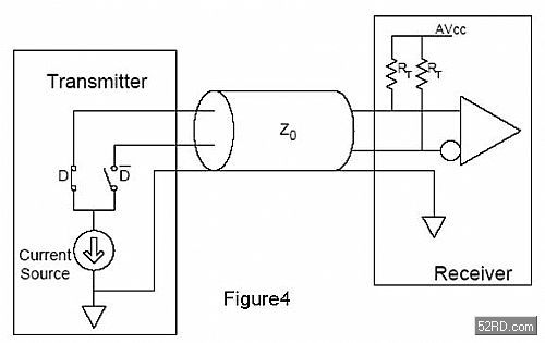 許多設(shè)計(jì)人員都很熟悉電壓驅(qū)動(dòng)應(yīng)用,并因此很自然地設(shè)想導(dǎo)通阻抗是開關(guān)選擇中最重要的規(guī)格。這種設(shè)想出于在電壓源應(yīng)用中,導(dǎo)通阻抗往往會(huì)引起插損和信號(hào)衰減。但幸運(yùn)地,HDMI 和 DVI信號(hào)并沒有這個(gè)問題,因?yàn)樗鼈兪褂镁哂薪K端電阻的電流源來(lái)建立信號(hào)電平。圖4所示為如何建立TMDS信號(hào)的基本原理圖。