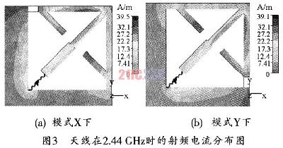 [page]由于兩種工作狀態(tài)下,天線的接地端不同,因此,天線的有效輻射部分也有所不同。當處于X模式時,天線結(jié)構(gòu)中垂直部分的微帶線接地,因此,天線的輻射部分應(yīng)該為水平部分的微帶,天線也相應(yīng)工作在水平極化方式。圖3所示為天線在2.44GHz時的射頻電流分布圖。