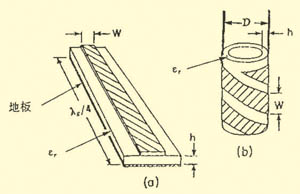 把一體化電視機(jī)視為一種計(jì)算機(jī)以后,只要把全方位螺旋微帶貼片天線直接插入數(shù)字電視機(jī)就能收看電視節(jié)目,在移動(dòng)中接收數(shù)字電視,因?yàn)樾盘?hào)隨地理位置而變化,信道特性作動(dòng)態(tài)變化,這就要求天線對(duì)不同信道的動(dòng)態(tài)特性變化的穩(wěn)定可靠性做出實(shí)時(shí)反映,在移動(dòng)中天線需在全方位范圍內(nèi)保持一定的帶寬和增益。為此我們?cè)O(shè)計(jì)出一種全方位圓柱體螺旋微帶貼片天線,它把1/4波長(zhǎng)的微帶諧振器呈螺旋狀地繞在具有一定厚度(h)的空心圓柱體上,其微帶貼片與地板構(gòu)成同軸圓柱體,體積比較小,可以和任何載體共形(例如汽車(chē)),同時(shí)也能設(shè)計(jì)成任何規(guī)格(例如:50Ω,75Ω)的帶線與同軸聯(lián)結(jié)器聯(lián)結(jié),不需要匹配網(wǎng)絡(luò),且空芯內(nèi)部可以安裝有源電子器件。圖1就是1/4波長(zhǎng)全方位微帶螺旋貼片天線的示意圖,(a)是1/4波長(zhǎng)微帶諧振器,(b)是1/4波長(zhǎng)全方位微帶螺旋貼片天線的示意圖。