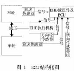 在中小型車輛的傳統(tǒng)制動系統(tǒng)中,駕駛員通過制動主缸在輪缸建立制動壓力,而EHB則是通過蓄能器提供制動壓力。蓄能器壓力由柱塞泵產(chǎn)生,可提供多次連續(xù)的制動壓力。EHB由傳感器、ECU及執(zhí)行器(液壓控制單元)等構(gòu)成,其結(jié)構(gòu)如圖1所示。