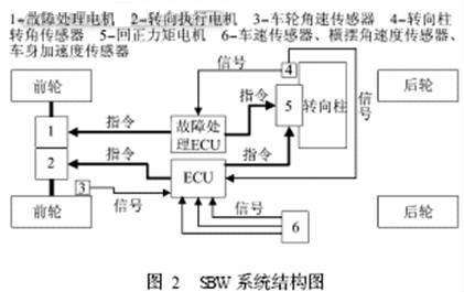 SBW的工作原理是當(dāng)轉(zhuǎn)向盤轉(zhuǎn)動時,轉(zhuǎn)向傳感器和轉(zhuǎn)向角傳感器將測量到的駕駛員轉(zhuǎn)矩和轉(zhuǎn)向盤的轉(zhuǎn)角轉(zhuǎn)變成電信號輸入到ECU,ECU依據(jù)車速傳感器和安裝在轉(zhuǎn)向傳動機(jī)構(gòu)上的位移傳感器的信號來控制轉(zhuǎn)矩反饋電動機(jī)的旋轉(zhuǎn)方向,并根據(jù)轉(zhuǎn)向力模擬,生成反饋轉(zhuǎn)矩,控制轉(zhuǎn)向電動機(jī)的旋轉(zhuǎn)方向、轉(zhuǎn)矩大小和旋轉(zhuǎn)角度,通過機(jī)械轉(zhuǎn)向裝置控制轉(zhuǎn)向輪的轉(zhuǎn)向位置,使汽車沿著駕駛員期望的軌跡行駛。